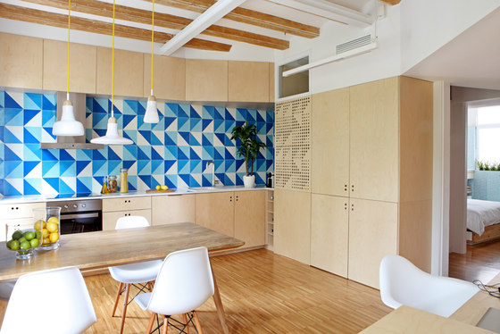 L’atmosfera fresca e luminosa della casa è il risultato di un attento equilibrio di materiali e finiture: arredi su misura in multistrato di betulla compongono la maggior parte dello spazio, parquet a pavimento, mosaici e piastrelle blu regalano una sensazione di comfort e freschezza richiamando vagamente gli interni di una barca.