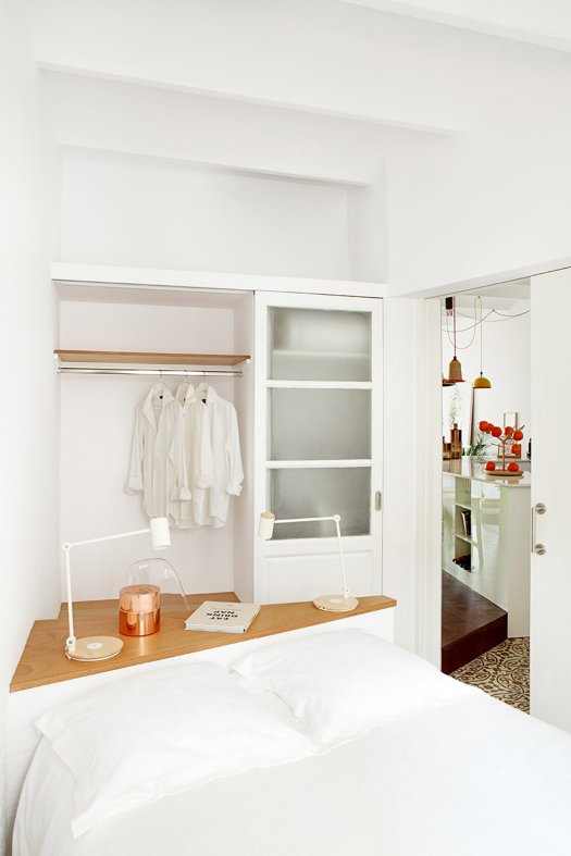 Entrambe le camere da letto matrimoniali offrono un’atmosfera più essenziale, con interni dipinti di bianco, mobili ibrido armadio-scrivania realizzati con il recupero delle porte originarie dell’appartamento e testate che seguono il percorso delle mura originali.
